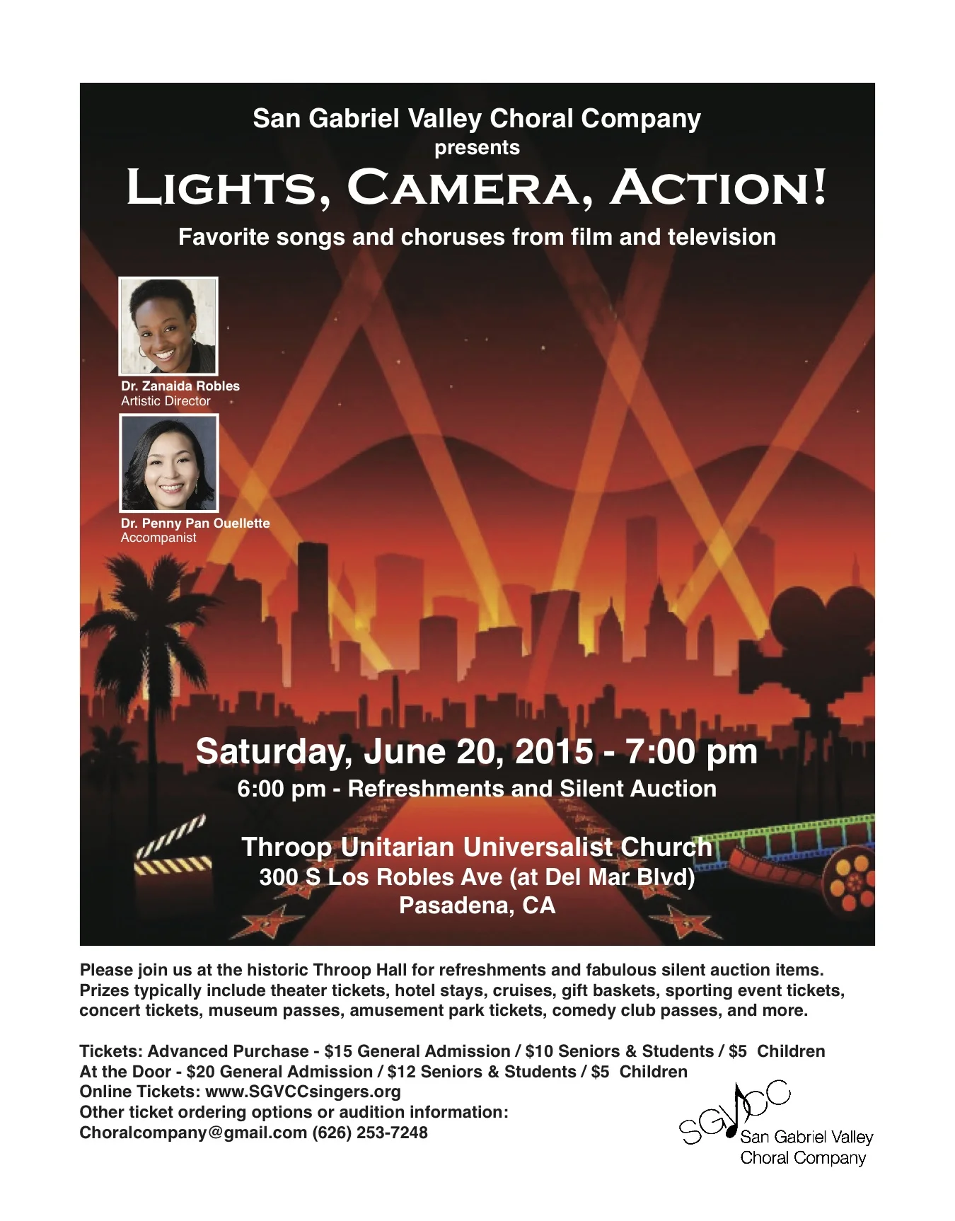 I so enjoy being the soprano soloist and section leader for the San Gabriel Valley Choral Company. On Saturday, June 20th, we will be performing a really fun concert called Lights, Camera, Action! It’ll be an evening of movie music. I’ll be singing Sooner or Later by Sondheim, and I’ll be joining Dr. Zanaida Robles and Yasumichi Ishikawa in a gorgeous trio from The Lord of the Rings called The Passing of the Elves. And I’ll be joining the chorus in selections including Down in the River to Pray, the Habanera, both Mozart and Verdi’s Dies Irae, and my personal favorite, Duel of the Fates by John Williams.