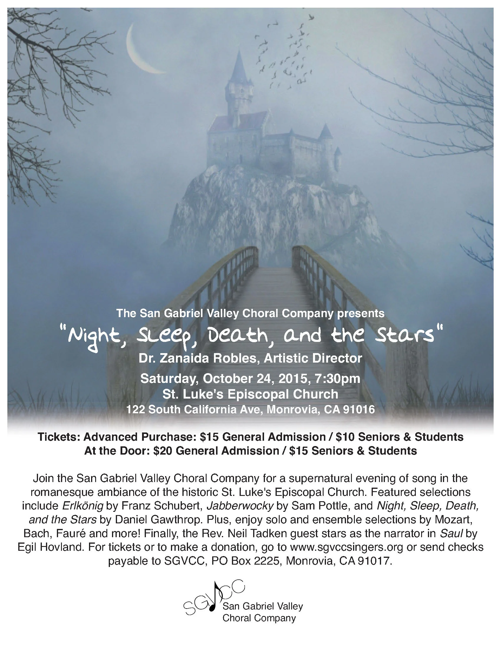 Join the San Gabriel Valley Choral Company for a supernatural evening of song in the romanesque ambiance of the historic St. Luke's Episcopal Church. Featured selections include Erlkonig by Franz Schubert, Jabberwocky by Sam Pottle, and Night, Sleep, Death, and the Stars by Daniel Gawthrop. Plus, enjoy solo and ensemble selections by Mozart, Bach, Fauré and more! Finally, the Rev. Neil Tadken guest stars as the narrator in Saul by Egil Hovland. For tickets or to make a donation, go to http://www.sgvccsingers.org or send checks payable to SGVCC, PO Box 2225, Monrovia, CA 91017.