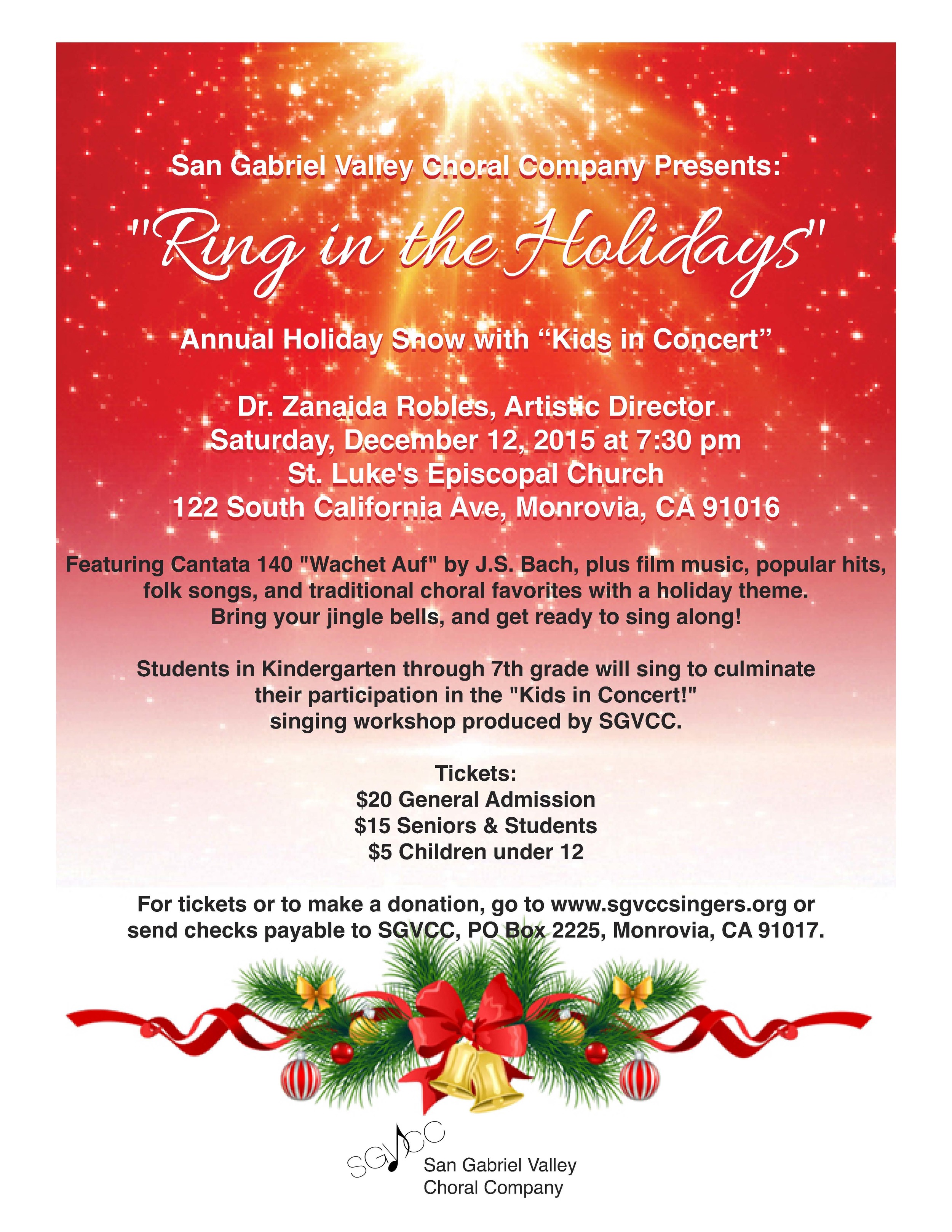 The concert will be on Saturday, December 12th, 2015, at 7:30pm at St. Luke’s Episcopal Church, 122 South California Ave., Monrovia, CA 91016. Tickets are available at http://www.sgvccsingers.org or at the door. $20 General Admission, $15 Students & Seniors, and $5 Children under 12. (This is a fun one for the kids - SGVCC will be joined by “Kids in Concert” for certain selections.)