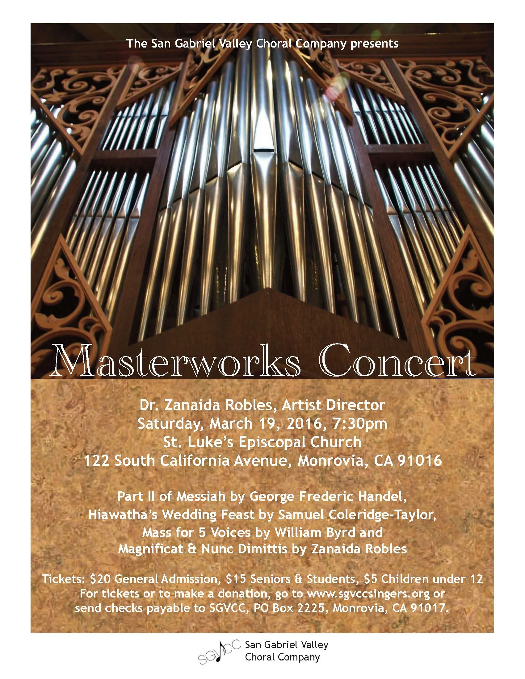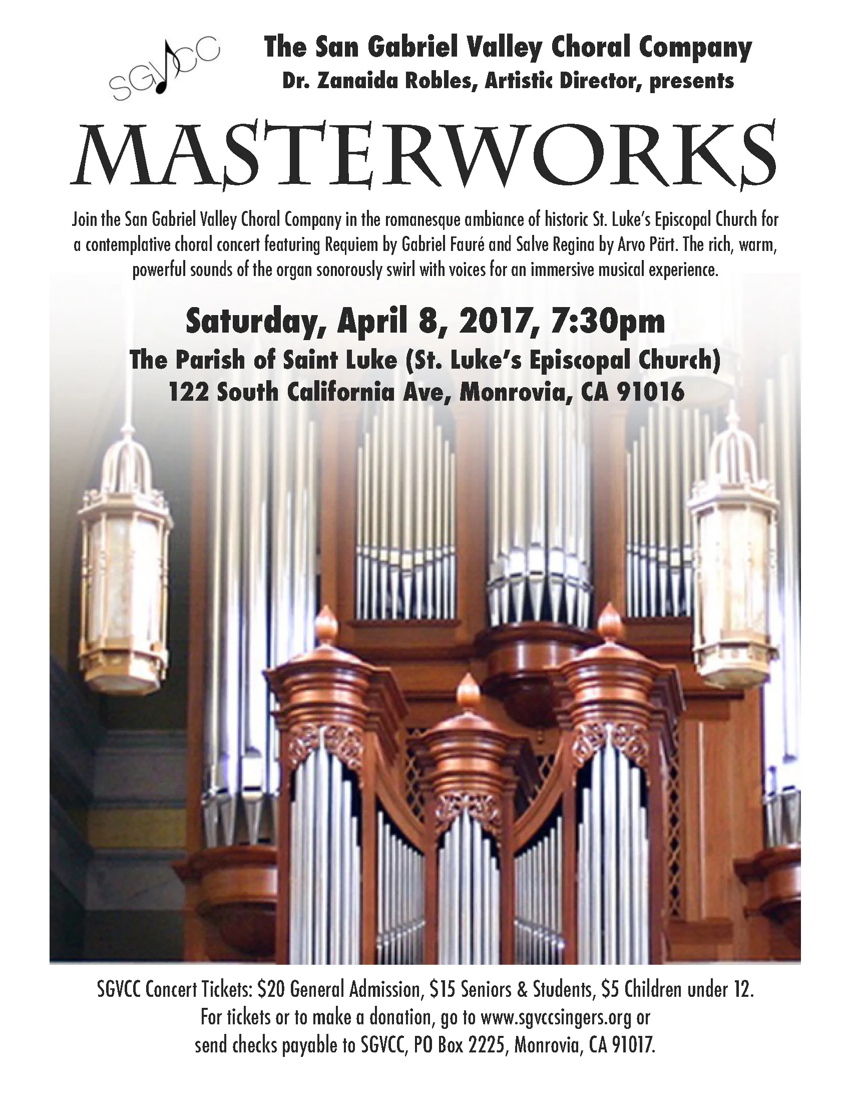 MONROVIA, CA(March 8th, 2017) On Saturday, April 8th, 2017, at 7:30pm, join the San Gabriel Valley Choral Company (SGVCC) for their presentation of Masterworks at the Parish of Saint Luke’s (Saint Luke’s Episcopal Church, 122 South California Avenue, Monrovia, CA91016).